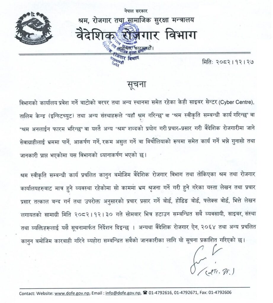 सार्वजनिक सूचना जारी गर्दै विभागले विभाग कार्यालय वरपर तथा अन्य स्थानमा रहेका केही साइबर सेन्टर, इन्स्टिच्युट तथा संस्थाले ‘श्रम गरिन्छ’, ‘श्रम स्वीकृति सम्बन्धी काम गरिन्छ’ वा ‘श्रम अनलाइन फारम भरिन्छ’ जस्ता शब्द प्रयोग गरी वैदेशिक रोजगारीमा जाने सेवाग्राहीलाई भ्रममा पार्ने, आकर्षित गर्ने र रकम असुल्ने गरेको गुनासो आएको विभागले जनाएको छ।
