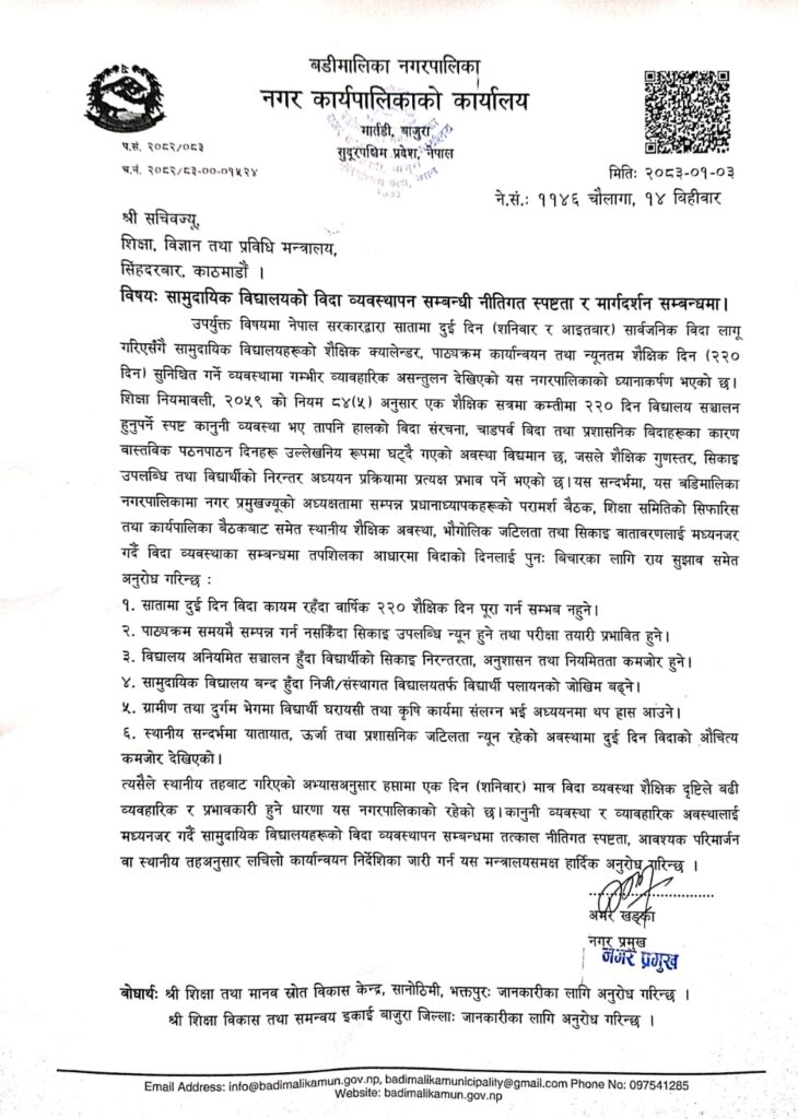 हप्तामा दुई दिन बिदा हुँदा विद्यार्थीकाे पढाइ प्रभावित हुने बडिमालिकाकाे निष्कर्ष, मन्त्रालयलाई यस्ताे पत्र पठायाे