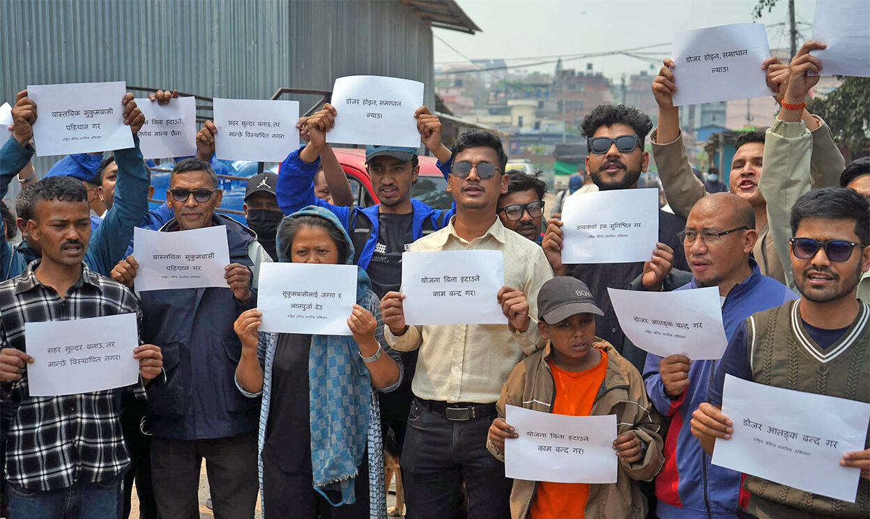 काठमाडौंको थापाथली क्षेत्रमा रहेका सुकुमवासी बस्ती खाली गराउने सरकारी निर्देशनविरुद्ध स्थानीय बासिन्दा आन्दोलनमा उत्रिएका छन्। उनीहरूले बिहानैदेखि प्लेकार्ड बोकेर नाराबाजीसहित विरोध प्रदर्शन गरेका छन्।