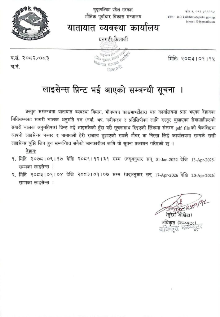 हुलाकमार्फत धनगढी पठाइएकोमा यो अवधिमा नयाँ, थप नवीकरण र प्रतिलिपीका लागि दस्तुर बुझाएका सेवाग्राहीका लाइसेन्स रहेको यातायात कार्यालयले जनाएको छ ।